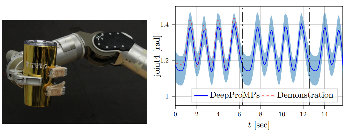 Figure 5.5: Left: Experimental setup of Make Mojito. Right: Demonstrated motion and learned cyclical behaviour. Results demonstrate that DeepProMPS can smoothly repeat cyclical motions indefinitely.
